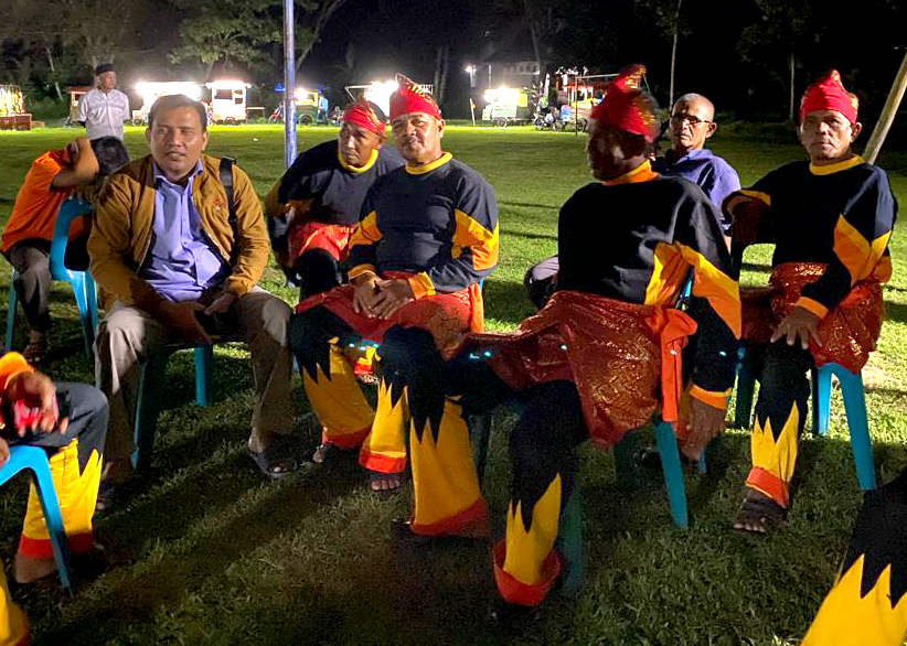 Di sebuah tenda kecil di sisi kiri panggung, sekelompok pria paruh baya duduk dengan pakaian hitam dan celana senda dengan motif kuning di bawahnya, di kepala mereka terpasang teungkulok berwarna merah. Pria-pria kekar dari Pase, Aceh Utara khusus diundang untuk berkolaborasi dalam acara Road Show Kesenian Berbasis Gampong yang digelar Dinas Kebudayaan dan Pariwisata Provinsi Aceh di desa wisata Lubok Sukon, Kecamatan Ingin Jaya, Kabupaten Aceh Besar, Senin, 27 November 2023.