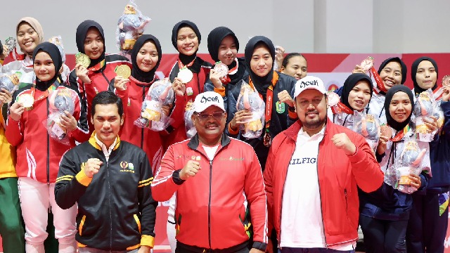 HABADAILY.COM – Cabang olahraga Anggar kembali mempersembahkan medali emas untuk Aceh, melalui nomor Sabel Beregu Putri. Usai pertandingan final, Penjabat Gubernur Aceh Safrizal ZA, yang sejak awal laga menyaksikan aksi tim Aceh, mengalungkan medali kepada para pemenang.