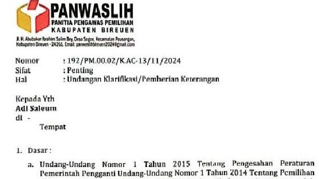 Pemanggilan tersebut dilayangkan Panwaslih Bireuen melalui Surat Nomor 192/PM.00.02/K.AC-13/11/2024, bersifat penting dengan perihal memberikan keterangan.