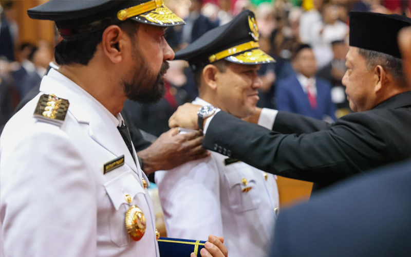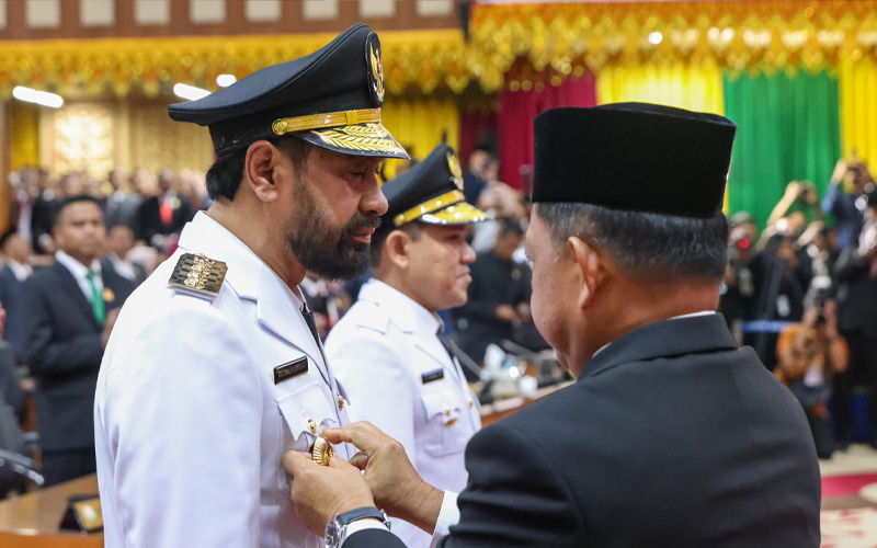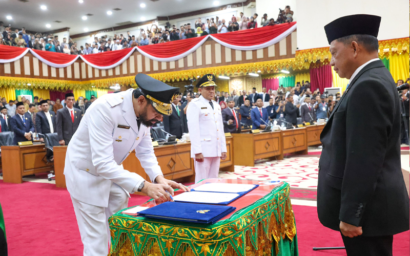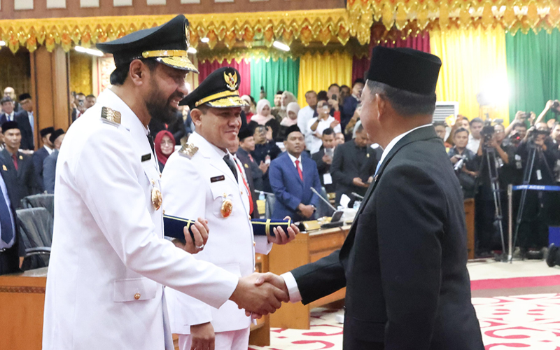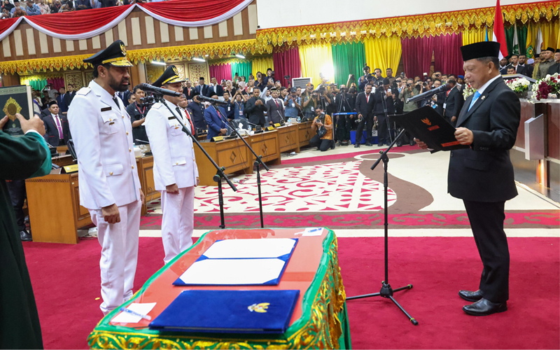 Menteri Dalam Negeri (Mendagri) Tito Karnavian, mengambilan sumpah jabatan dan pelantikan Gubernur dan Wakil Gubernur Aceh, pasangan Muzakir Manaf dan Fadhlullah (Mualem-Dek Fad), dalam rapat paripurna istimewa DPR Aceh di Gedung Utama DPRA, Banda Aceh, Rabu (12/2/2025). (Foto: Humas Aceh).