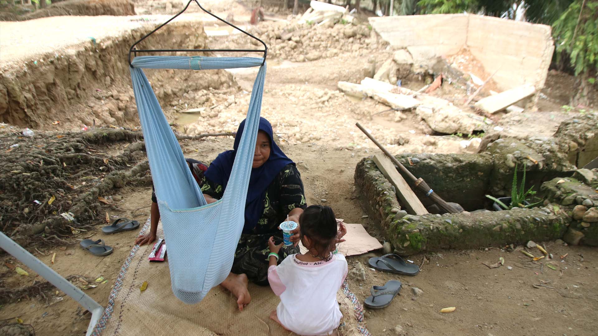 Seorang ibu tampak sedang mengayun anaknya di depan reruntuhan rumah miliknya yang hancur diterjang banjir bandang pada 26 November 2025 lalu di Sawang, Aceh Utara. Foto diambil pada Jumat, 26 Desember 2025. (FOTO: Suryadi KTB | HABADAILY.COM)