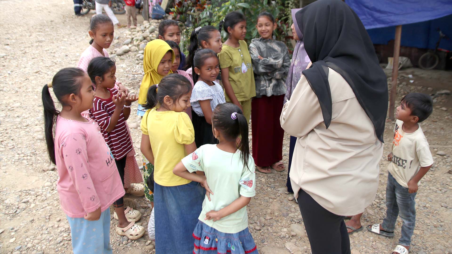 Anak anak korban bencana banjir bandang di Aceh Utara sedang bermain dan berdialog dengan relawan, Jum'at 26 Desember 2025. (FOTO: Suryadi KTB I HABADAILY.COM)