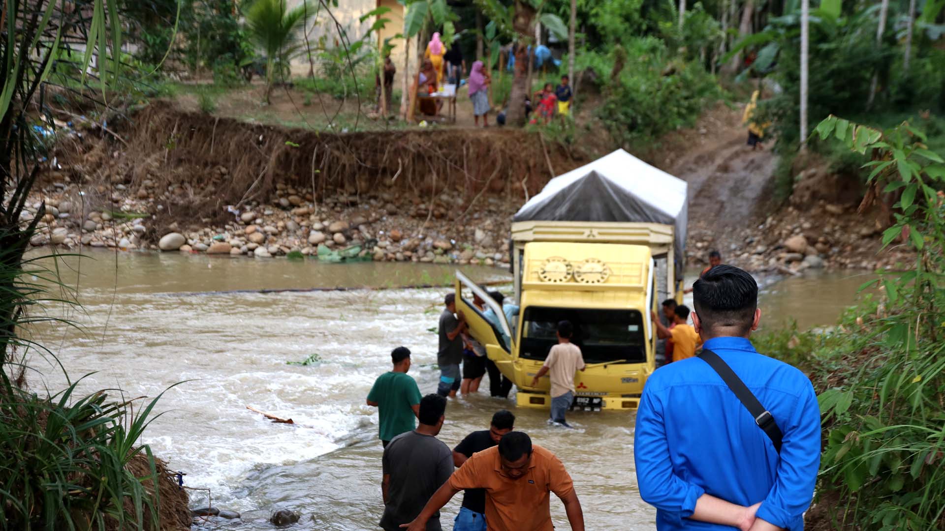 Truck pengangkut bantuan logistic tertahan saat melintasi sugai di Sawang, Aceh Utara. daerah ini salah satu wilayah terparah pasca banjir bandang di Aceh pada 26 November 2025. Jum'at 26 Desember 2025. (FOTO: Suryadi KTB I HABADAILY.COM)